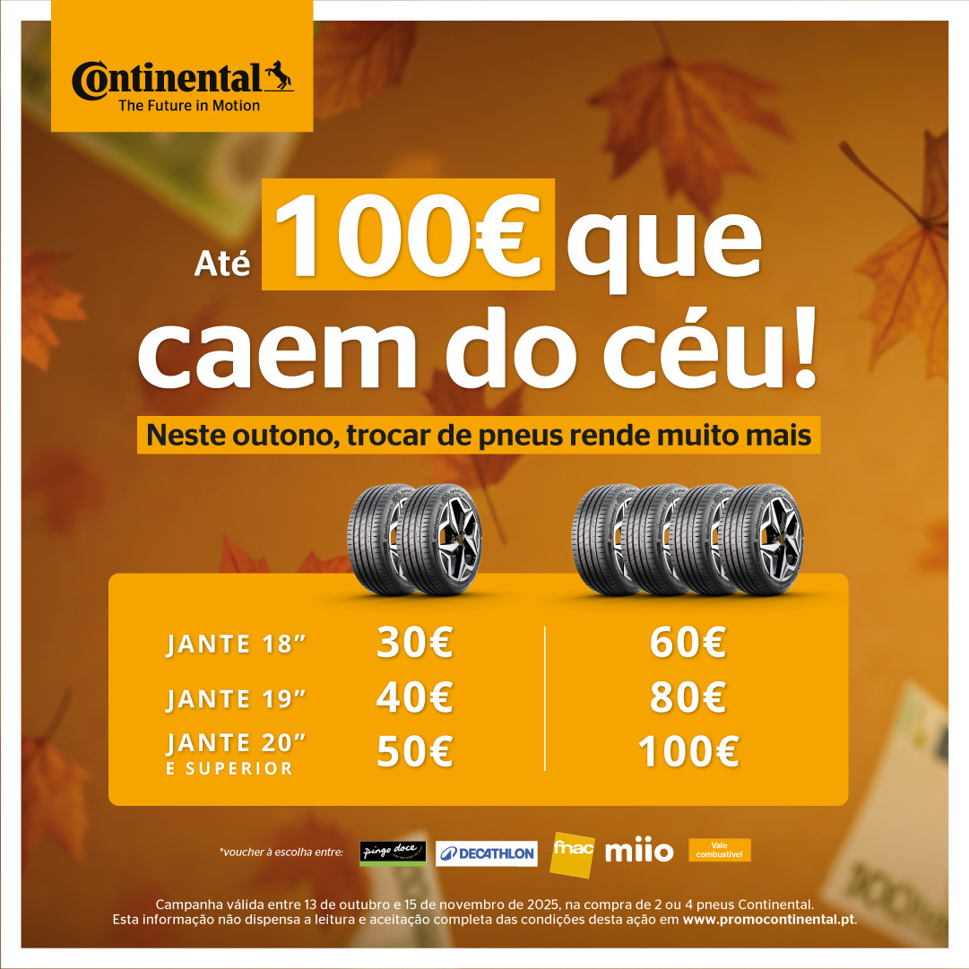 De 13 de outubro a 15 de novembro, receba até 100€ em vouchers na compra de pneus Continental. 🛞